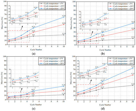 When the ratio of slag to FA remained constant, the impact of lower freezing temperatures became evident. As shown in Figure 10a, final mass loss at freezing temperatures of −10 °C and −20 °C surged to 46.96% and 63.96%, respectively, for SF100, confirming that low temperatures accelerate mass loss. Similarly, SF90 samples reached 35.28% and 50.28% in Figure 10b, respectively. For SF80, final mass loss rose to 20.99% and 31.38% under the same conditions. SF70 exhibited the most severe mass loss increase at lower temperatures, with final mass loss of 57.37% and 73.37% in Figure 10d, confirming that as freezing temperature decreased, the mass loss of OP-ASF stabilized soft soil samples increased significantly.