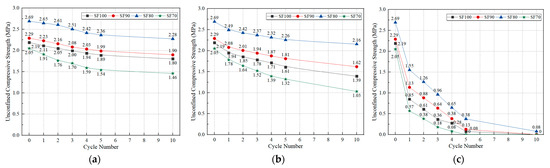 After a certain number of freeze-thaw cycles, the UCS value of OP-ASF stabilized soft soil samples was tested. The UCS values for OP-ASF stabilized soft soil before (i.e., 0) and after (i.e., 1 to 10) freeze-thaw cycles are shown in Figure 11. Before freezing, the UCS values of OP-ASF stabilized soft soil samples SF100, SF90, SF80, and SF70 after 28 days of standard curing were 2.19, 2.29, 2.69, and 2.05 MPa, respectively. Among these, the SF80 sample demonstrated the highest UCS, while SF70 exhibited the lowest. The UCS trends after freeze-thaw cycles for stabilized soft soil samples with four different slag to fly ash ratios were similar. The UCS of samples with a slag to fly ash ratio of 80:20 was larger than that of those with other slag to fly ash ratios, likely because a small amount of fly ash would promote the long-term increase in strength of OP-ASF stabilized soft soil. Before entering the freeze-thaw cycle, the stabilized samples underwent a 4-day soaking stage, during which water entered through surface cracks, internal pores, and capillaries. During freezing, as water entered the sample, the cold environment caused the outer layer of water to freeze, expanding the ice volume within the pores and increasing the pore count. These expanded pores formed cracks on the sample surface, allowing it to absorb more water during freezing and form additional ice in the next cycle. According to the mechanism of water migration in frozen soil [44,45], in a low-temperature environment, the surface temperature of the sample was lowest, drawing water from the interior to the surface and supplying more moisture for ice crystal formation. This process created additional cracks and pores, forming a porous structure within the sample that weakened structural support, ultimately reducing the compressive strength of OP-ASF stabilized soft soil.