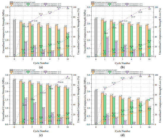 Figure 12a–d present the UCS values and UCS loss of OP-ASF stabilized soft soil under different freeze-thaw cycles. As shown in the figures, the UCS of these stabilized soft soils decreased significantly with an increasing number of freeze-thaw cycles. Following 28 days of standard curing, the UCS of sample SF80 was higher than that of samples with other ratios. In Figure 12a, under a freezing temperature of −5 °C, the UCS of OP-ASF stabilized soft soil with 100% slag decreased from 2.19 MPa to 1.56 MPa after 10 freeze-thaw cycles, representing a UCS loss of 29.05%. At lower freezing temperatures, UCS losses were even more pronounced, with increases of 17.84% and 53.11%, respectively, when compared to −5 °C conditions. Similarly, in Figure 12b, the initial UCS of the sample with a slag to fly ash ratio of 90:10 was 2.29 MPa, dropping to 1.65 MPa after 10 freeze-thaw cycles, with a UCS loss of 27.77%. When frozen at −10 °C and −20 °C, the UCS losses increased by 16.15% and 56.18%, respectively, compared to those at −5 °C. In Figure 12c, under −5 °C conditions, the UCS value of the stabilized soft soil sample with slag to fly ash ratio of 80:20 decreased from 2.69 MPa to 2.00 MPa after 10 freeze-thaw cycles, with a UCS loss of 25.75%. Freezing at −10 °C and −20 °C increased the UCS loss by 14.40% and 56.95%, respectively, compared to −5 °C. Finally, in Figure 12d, the UCS of the sample with 70:30 slag to FA ratio fell from 2.05 MPa to 1.40 MPa after 10 cycles at −5 °C, with a UCS loss of 31.97%. Lower freezing temperatures of −10 °C and −20 °C raised the UCS loss by 23.87% and 44.16%, respectively, compared to −5 °C. These UCS trends mirror those in the mass loss results, suggesting freeze-thaw cycles degrade both the surface and internal structures of stabilized soft soil, leading to a loss of compressive strength. The higher UCS loss observed at lower freezing temperatures further supported the need for optimizing the slag to fly ash ratio and freeze-thaw cycle conditions to enhance soil stabilization.