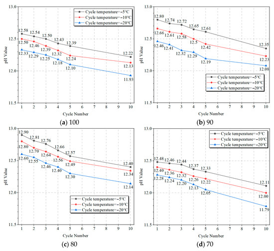 - The mass loss and UCS loss increase with the number of freeze-thaw cycles. After 10 cycles, both reach their highest values. Additionally, as the freezing temperature decreases, the mass loss and UCS loss increase, with the maximum mass loss occurring at −20 °C. The pH value also decreases over time, indicating a weakening of the alkalinity in the stabilized soft soil, especially at lower temperatures.
