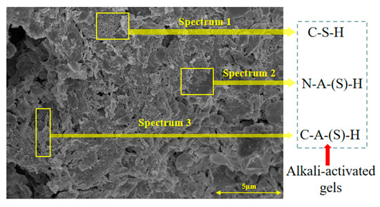 To gain further insights into the above macroscopic results of OP-ASF stabilized soft soil, SEM-EDS was employed to analyze the microstructure of the samples. SEM images revealed the development of alkali-activated gels, cracks, and pores, which were essential in explaining the observed mass loss and decreased UCS under varying freeze-thaw conditions. EDS analysis of OP-ASF stabilized soft soil is presented in Figure 14, and the element content of alkali-activated gels is shown in Table 4. The EDS results are consistent with previous research [34,46,47,48], highlighting that the alkali-activation process of slag and FA differed from traditional cement systems. The resulting gels primarily included net-like calcium silicate hydrates [C-S-H], slat-like calcium aluminate (aluminosilicate) hydrates [C-A-(S)-H], and amorphous sodium aluminosilicate hydrates [N-A-S-H], which SEM-EDS analysis verified [49].