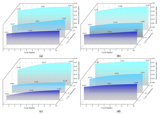 Structure looseness index of OP-ASF stabilized soft soil under freeze-thaw cycles: (a) SF100; (b) SF90; (c) SF80; (d) SF70.