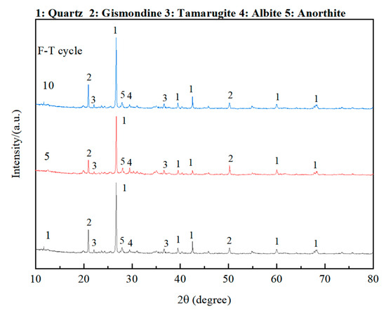 To investigate the main phase changes in OP-ASF stabilized soft soil during freeze-thaw cycles, XRD analysis was conducted. Figure 16 displays the XRD patterns of OP-ASF stabilized soft soil, using SF80 as a representative sample, after one, five, and 10 freeze-thaw cycles at a freezing temperature of −20 °C. The primary mineral phases identified include quartz, gismondine, tamarugite, albite, and anorthite. The results indicated that the mineral composition remained essentially unchanged throughout the freeze-thaw cycles. No new crystalline phases were detected within the 2θ range of 20–35°, which corresponded to the characteristic region of alkali-activated gels. This suggested that OP-ASF stabilized soft soil exhibited high mineralogical stability under freeze-thaw conditions, and its amorphous gel structure remained intact and resistant to damage.