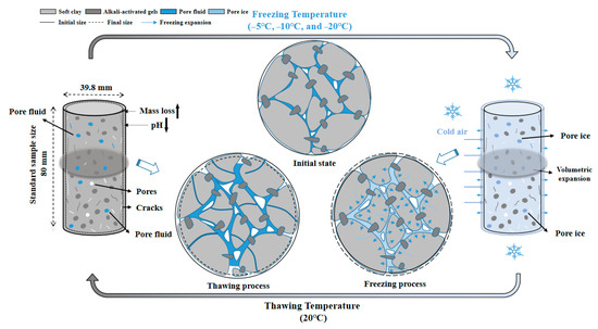 Based on the above experimental results and microscopic analysis, the freezing resistance mechanism of OP-ASF stabilized soft soil can be divided into three stages, as shown in Figure 17.