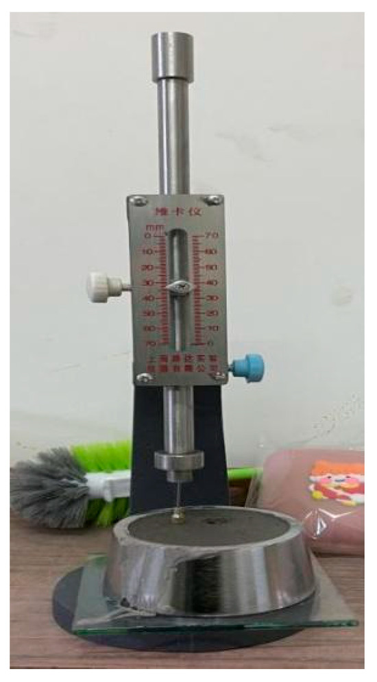 To accurately observe the condition of the test needle sinking, a ring-shaped accessory was installed on the final setting needle. After completing the initial setting time measurement, the test mold along with the paste was immediately removed from the glass plate and flipped 180 degrees, with the larger end facing up and the smaller end down, then placed back on the glass plate. It was then put into a moisture curing box for further curing. Near the final setting time, measurements were taken every 15 min. When the test needle sank 0.5 mm into the specimen, indicating that the ring-shaped accessory could no longer leave a mark on the specimen, it was considered that the cement had reached the final setting state. The time from when all the cement was added to water until it reached the final setting state is referred to as the final setting time of the cement, expressed in minutes. Measurement data were collected for each group of three specimens, with the average value used. The setting time of the cement slurry is measured as shown in Figure 3.