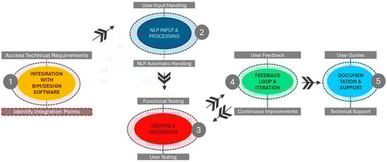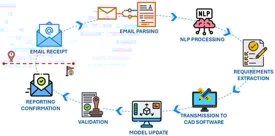 The NLP model, after it has been trained, needs to be integrated into the CAD software. This study identified and proposed five (5) steps towards the development of a framework that automates the integration process, as illustrated in Figure 1. The integration of NLP tools with CAD software begins with identifying integration points [], determining where the NLP tool will fit into the existing CAD framework. This can be achieved through APIs, through direct database access, or as a standalone plugin. Understanding the BIM software’s technical requirements, including its programming languages, frameworks, and data formats, is crucial to ensuring compatibility []. Users can input natural language descriptions of their design requirements, feedback, or modifications if the process is manual [], and this, in turn, is communicated to the CAD software. The other option is the automated process, where the proposed NLP tool processes relevant design parameters and requirements from emails and communicates this process to the CAD software for automated design [,].