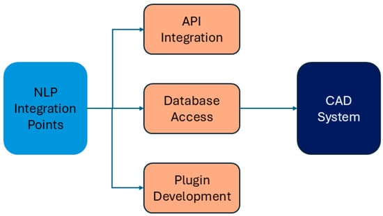 As illustrated in Figure 2, the framework allows for multiple integration strategies between NLP-generated design data and CAD environments. These approaches are grounded in real-world practices supported by leading CAD platforms such as Autodesk Revit, AutoCAD, and ArchiCAD. APIs offer the most direct route for automation, while plugin development provides customizable UI-level extensions. Database access supports batch operations and advanced querying in BIM workflows. Each pathway is practically implementable using well-documented SDKs, middleware tools, and scripting libraries, affirming the technical feasibility of the proposed integration model.
