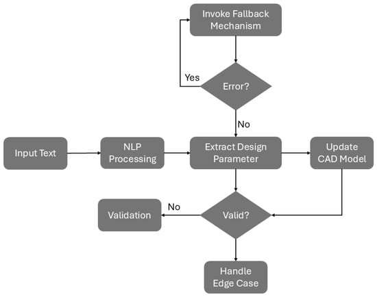 While Figure 3 in Section 4.4 illustrates a streamlined example of automating CAD updates using NLP-extracted design inputs, real-world implementation necessitates robust mechanisms to handle input variability, system errors, and output validation. For example, Error handling is critical across various stages of the NLP-CAD pipeline, including input parsing, entity recognition, data transmission, and CAD command execution, as seen in Figure 4. Strategies for managing errors include input validation filters that screen incoming text for unsupported file formats, missing content, or malformed data before NLP parsing; fallback rules that trigger human review or adjusted parsing logic when the system fails to extract sufficient design parameters; exception logging that records errors with timestamps, types, and affected components to support debugging and audits; and retries with timeouts, where API or database failures activate retry logic with exponential backoff to maintain reliability without overloading the system.