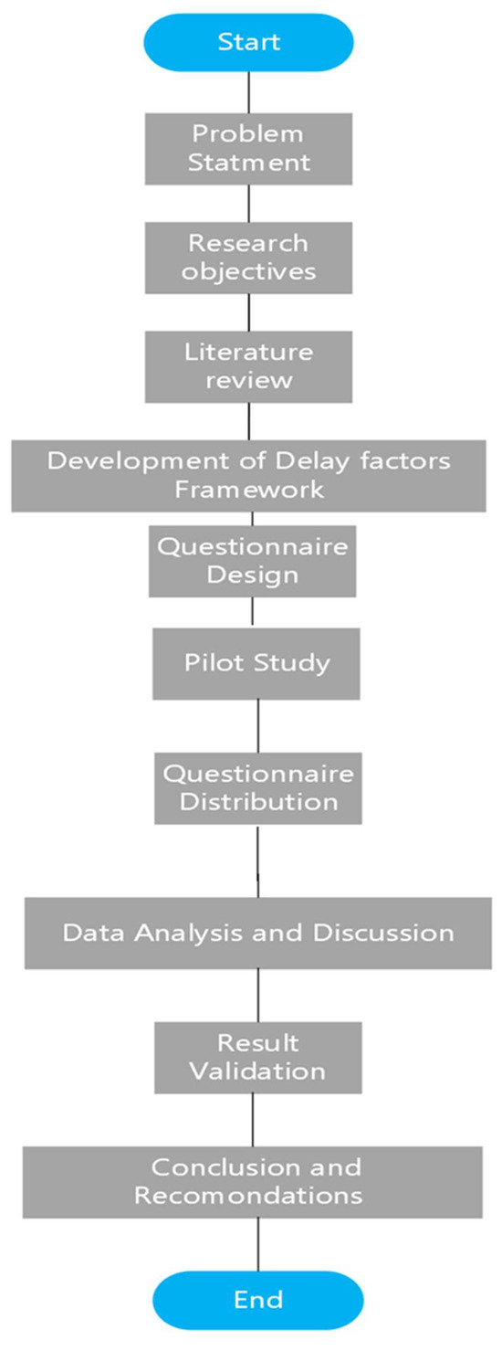 The pilot questionnaire consisted of two main sections: (1) 27 construction delay factors and (2) 27 proposed solution strategies. Each item was rated on a five-point Likert scale (1 = Strongly Disagree to 5 = Strongly Agree). The research stages are illustrated in the Figure 1.