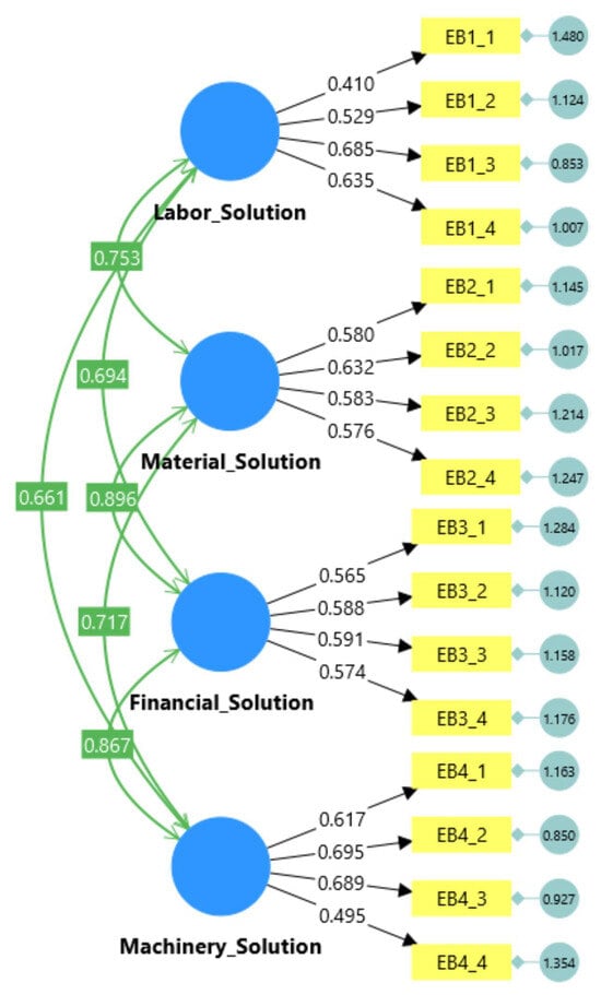 Table 7 and Figure 5 shows the standardized loadings of the CFA for potential key solutions for construction delay factors [29], identifying the most significant interventions across the four input factors. For labor, providing incentives to enhance worker motivation (0.685) and investing in training programs (0.635) demonstrated the strongest impact. Within the material factor, establishing clear delivery schedules (0.632), implementing quality control measures (0.583), and maintaining strategic reserves (0.580) proved most effective. Financial solutions showed consistent effectiveness across all options (0.565–0.591), with periodic budget reviews (0.591) and defining clear payment schedules (0.588) slightly outperforming others. The machinery factor revealed the strongest overall solutions [30], particularly regular equipment maintenance (0.695), thorough pre-selection research (0.689), and comprehensive machinery allocation planning (0.617).