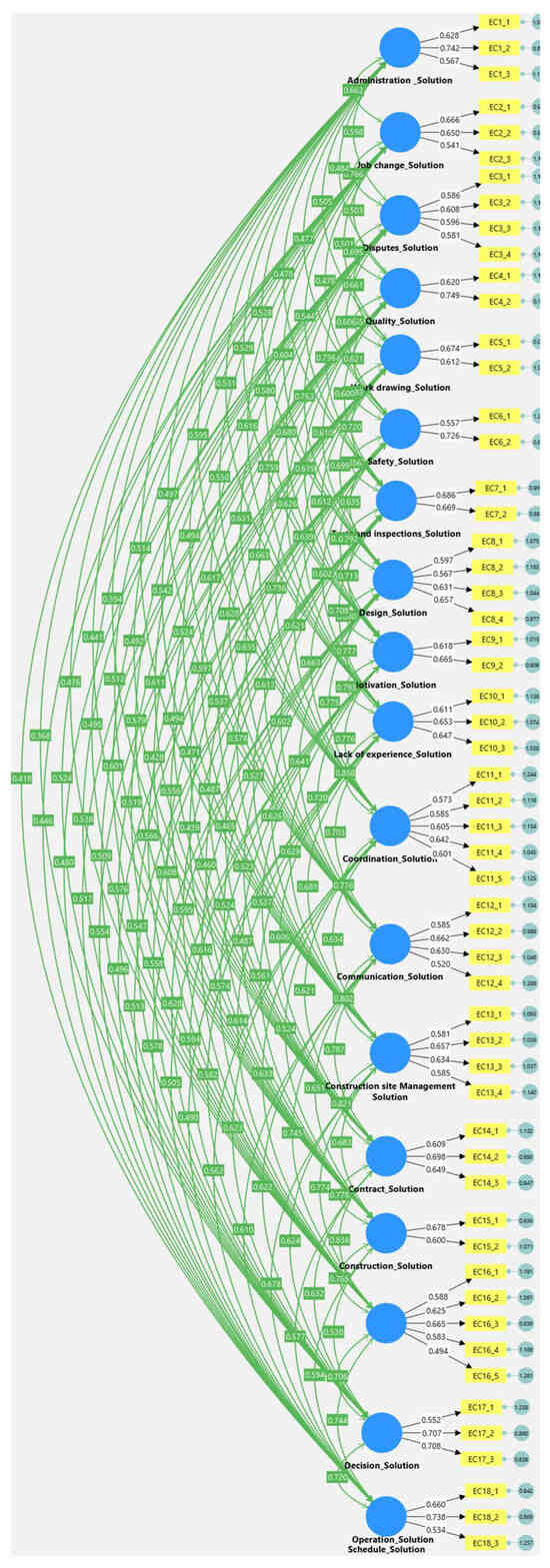 Table 8 and Figure 6 shows the confirmatory factor analysis (CFA) of potential key solutions for internal delay factors in building construction which reveals an interconnected network of 18 solution categories with varying levels of effectiveness. The standardized loadings indicate that the most impactful interventions include [29] management (0.738), administrative measures (0.742), decision-making processes (0.707, 0.708), quality control (0.749 [31]), and safety protocols (0.726). Additionally, tests and inspections (0.686), contract management (0.698) [32], and work drawing solutions (0.674) demonstrate strong potential for reducing delays. The extensive green network connections in the diagram emphasize that these solutions function as an integrated system rather than isolated interventions, suggesting that a comprehensive approach addressing multiple internal factors simultaneously would be most effective in mitigating construction delays, with particular attention to the highest-loading solutions identified across the various categories.