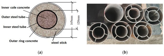 The considered parameters included the RBA replacement ratio of the inner core concrete and outer ring concrete. Recycled aggregate concrete with a 25% brick aggregate replacement ratio and common concrete without recycled aggregates were poured into six specimens, based on pre-design conditions. All specimens have a 4 mm thick inner tube and 4 mm, 5 mm, and 6 mm thick outer tubes, respectively. The inner steel tube was placed inside the outer tube and fixed at the center location of the outer tube with four short steel sticks around the inner tube, as shown in Figure 1. The steel sticks, measuring almost 22 mm in length and 6 mm in diameter, were pre-welded onto the surface of the inner steel tube before concrete casting. Detailed parameters of the specimens are shown in Table 1. The specimens in the table are named in the pattern of “A–B–C–D”: “A” and “C” denote the thickness (in mm) of the outer and inner steel tubes, respectively, and “B” and “D” refer to the RBA replacement ratio (expressed as a percentage) of coarse aggregates of the outer ring and inner core concrete.