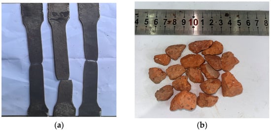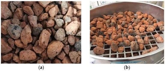 Coarse RBA. (a) Detail of brick aggregates; (b) recycled brick aggregates with different particle size gradations.
