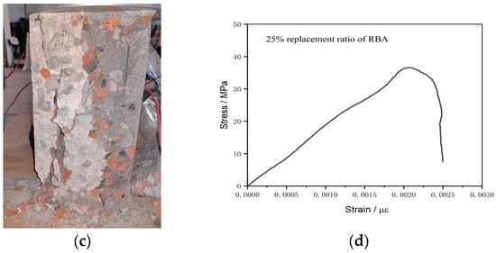 In this study, coarse aggregates were mixed with recycled brick aggregates instead of natural aggregates. A total of two mixtures were adopted, which corresponded to two replacement percentages—0% and 25%—for RAC. As shown in previous studies, a substitution rate of 25% is the point at which strength is significantly affected []. The concrete was manufactured by mixing the cement with ordinary water, fine aggregate, NA, and RBA. For cement, ordinary Portland cement with 42.5 MPa strength was adopted. River sand with a diameter of less than 2 mm was used as the fine aggregate. The particle size of the coarse aggregates, divided into natural aggregates and RBAs, ranged from 5 to 20 mm, as shown in Figure 2a,b and Figure 3b. The RBAs were meticulously screened manually from the mixing recycled aggregates, which were provided by Shenyang Ring City Ecological Environment Management Co., Ltd. (Shenyang, China). The RBAs, with special mechanical properties, were tested first, and the RBA properties were subsequently tested. Specimen preparation followed the Chinese code ‘Standard for Test Methods of Concrete physical and mechanical properties’ []. Details on the RBAs and concrete are outlined in Table 2. The mix ratio design and concrete properties are shown in Table 3. The admixture dosage recommended by the manufacturer was used for our specific concrete mix design, combined with our laboratory-optimized proportions to achieve the target workability and strength requirements. The concrete slump was tested during casting. The slump of recycled concrete is 158 mm on average. The recycled concrete meets the requirements for workability. After curing under the condition of 600 °C·day, compressive testing on a 150 mm × 150 mm × 300 mm specimen was carried out in the laboratory. The stress–strain curve of concrete with a 25% RBA replacement ratio is shown in Figure 3d. It is worth noting that, after the peak, the test block suddenly cracked, and the descending section could not be accurately measured.