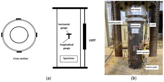 For the specimens tested in this study, four pairs of strain gauges were installed on the middle-height area equally installed along the circumference of the outer steel tube. Each pair included one longitudinal strain gauge to measure the axial strain during loading and one horizonal strain gauge to measure the lateral strain gauge, as shown in Figure 4a,b. The strain gauges attached to the outer steel tube surface are all adhesive-based strain gauges with resistance specifications of 3 × 20 mm, which ensures the accuracy of strain measuring of the steel tube. The resistance value of the strain gauge is usually measured before the test. An effective working resistance value of 120 ± 4 is considered. In addition, one linear variable differential transducer (LVDT) was used to monitor the longitudinal displacement of specimens for each specimen. The strain and displacement gauges on the specimen were all connected to the DH3825 dynamic signal acquisition instrument, which automatically collected the data. All the specimens were tested under axial compression provided by a 5000 kN pressure testing machine. Two ball hinges were placed at the top and bottom side of the specimen, respectively. Each ball hinge connected to a loading plate with high stiffness to ensure uniform distribution of compressive stress, as presented in Figure 4a,b.