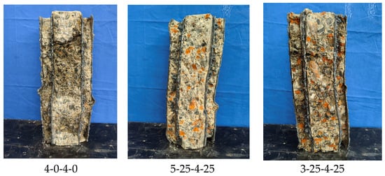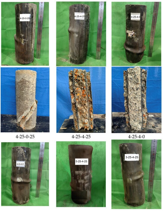 The specimens were cut open along the longitudinal cross-section after the experiment, in order to observe the internal situation. Specimen 4-25-0-25 is a control specimen with a 4 mm thick steel tube and 25% RBA substitution ratio. For specimen 4-25-0-25, buckling occurred on the body of the steel tube, about 23 mm from the column foot, along the column height. After removing the steel surface, large oblique cracks, penetrating about 45° from the bottom to a 23 mm height along the column, could be seen on the core concrete. It is obvious that the sharp bulging of the external steel tube of the specimen is not caused by the expansion of the compression section of the internal concrete under axial pressure, but by shear failure of the internal RBAC. Further investigation is warranted, as steel-tube-confined RAC may exhibit more pronounced brittle failure characteristics compared to ordinary concrete columns confined by steel tubes. Specimens 4-25-4-25, 5-25-4-25, and 3-25-0-25 are all confined by double steel tubes. All three have a common RBAC substitution ratio (25%) and inner steel tube thickness (4 mm) but different outer steel tube thicknesses (3 mm, 4 mm, and 5 mm). Although the bulge appears on the steel tube of each specimen, as shown in Figure 5, the internal cutting surface shows that there are no obvious oblique shear cracks on internal concrete. It is demonstrated that the existence of the inner steel tube strengthens the shear resistance of the specimens, the ductility of which is obviously improved. Bulges were all located at a half to a third of the column height of specimens, resulting from the dilation of the inner concrete under axial load. Comparatively, specimen 5-25-4-25, with the highest thickness, exhibited the best deformation characteristics. Seen from the cross-section of the specimen, the ring sharp concrete between the inner and outer steel tubes was more extensively damaged, while damage to the core concrete confined by the inner tube was negligible. Specimen 4-25-4-0 is filled with different concretes in the inner tube and the gap area between inner and outer tubes. Specimen 4-0-4-0 is the specimen whose inner and gap area between inner and outer tubes are all filled with ordinary concrete. Specimens 4-25-4-0 and 4-0-4-0 also showed good symmetric deformation ability, but the concrete in the ring area of specimen 4-25-4-0 was more seriously deformed than that in specimen 4-0-4-0, and the concrete in specimen 4-0-4-0 was less damaged.