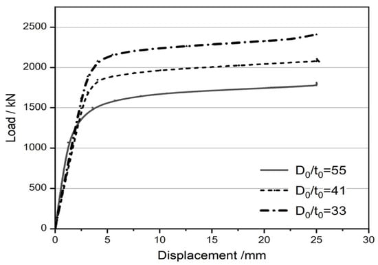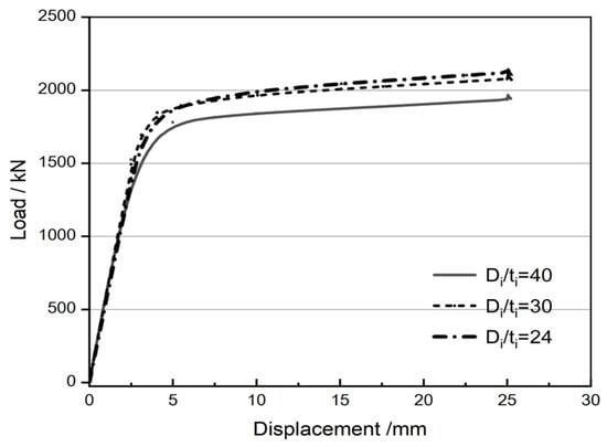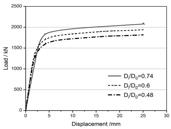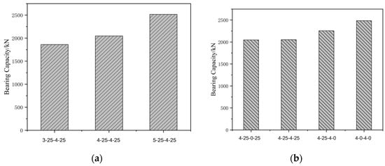 Specimens 4-25-4-25, 5-25-4-25, and 3-25-4-25 share the same concrete arrangement and inner steel tube thickness but differ in outer steel tube thickness. As shown in Figure 6a, the ultimate loads of specimens 3-25-4-25, 4-25-4-25, and 5-25-4-25, with outer steel tube thicknesses of 3 mm, 4 mm, and 5 mm, are 1862.2, 2052.9, and 2516.8 kN, respectively. It can be seen that the ultimate load of specimen 4-25-4-25 with a 4 mm thick outer tube is 10.2% higher than with a 3 mm thick outer tube, and the ultimate load of specimen 5-25-4-25 with a 5 mm thick outer tube is 35.2% higher than with a 3 mm thick outer tube. It can be concluded that the thickness of the outer tube has a significant effect on the ultimate load of RBCDST. The bearing capacity of RBCDST increases with the gradual increase in outer steel thickness.