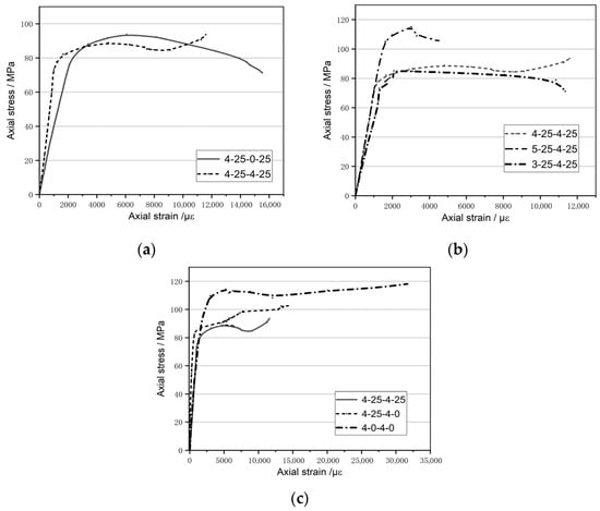 Figure 7c presents a comparison of axial stress–strain curves of specimens 4-25-4-25, 4-25-4-0, and 4-0-4-0, which indicates the replacement ratio effect on the behaviors of specimens. As presented in Figure 7c, the shapes of two curves (4-25-4-25 and 4-0-4-0) were similar, including the ascending stage, first peak point, concave stage, and recovery stage. Specimen 4-25-4-25, with a 25% brick recycled aggregate replacement ratio, has the lowest first peak stress but more pronounced behavior in the recovery stage compared to the other two specimens. Specimen 4-0-4-0, filled with common concrete without brick recycled aggregates, presents similar first peak stress and recovery performance. However, it can be seen that specimen 4-25-4-0, with different replacement ratios of concrete in the inner and outer tubes, presents the best behaviors, demonstrating higher first peak load and the best recovery performance. Specimen 4-25-4-0 has the best confinement combination, whose stress–strain curve is full and smooth without a concave stage. It is concluded that a combination of a strong core and weak ring region is the best choice for double steel tube columns.