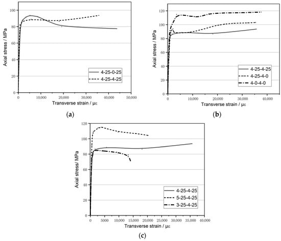 Figure 8b presents the transverse strain curves of specimens 4-25-4-25, 4-25-4-0, and 4-0-4-0. It can be seen from Figure 8b that the curve shape of lateral strain is similar to that of axial strain. The axial strain is higher than the lateral strain under unique load. The strain curve of specimen 4-25-4-25 presents a more obverse secondary ascending stage, which is different from the mutant shape observed for specimens 4-25-4-0 and 4-0-4-0. Figure 8c is the axial and lateral strain curves of specimens with different outer tube thicknesses. It is obvious that the transverse strain of the specimens under the three working conditions varies little with the load, at the initial stage before 1200 με. With the increase in load, the curve starts to deviate. With the increase in the wall thickness of the outer tube, the deformability of the specimen also increases gradually.