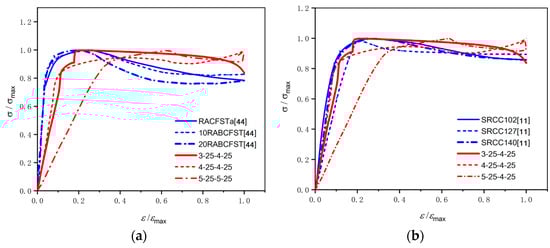Comparison of tested stress–strain curve and curves of similar work. (a) Comparsion of specimens in literature [] with current study; (b) Comparsion of specimens in literature [] with current study.