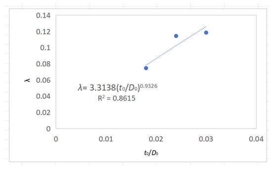 In this group of formulas (Equations (24)–(30)), fcc1 and fcc2 denote the ultimate strength of single-confined concrete and double-confined concrete, respectively. εcc1 and εcc2 are the corresponding strain values. Parameters k and i stand for the strength reduction factor. This parameter can be determined through regression of the test results. First, Equation (25) is suitable for RBAC-filled steel tubes. According to the test result, parameter k can be modified as 0.957. As shown in Equation (21), parameter i is related to the confinement of the outer and inner tubes. Therefore, parameter i can be considered from the test results. In this study, i is different for the double-tube-confined RBAC, with a difference in the thickness-to-diameter ratio of the outer steel tube, as shown in Figure 10.