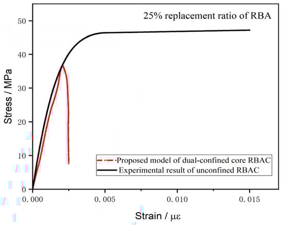 A comparison of the dual-confined core RBAC proposed model curve and the experimental curve of unconfined RBAC is shown in Figure 11. As can be seen from the figure, the elastic sections of the two curves match well. From this, it can also be concluded that the two have the same elastic modulus.