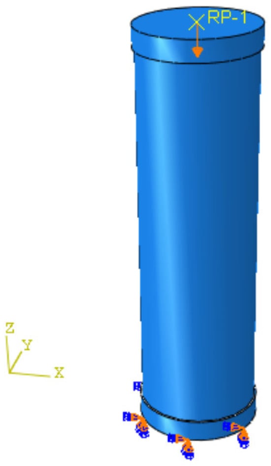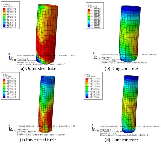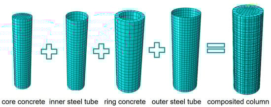 The circular RBCDST column is composed of three parts: the outer and inner steel tubes, sandwiched concrete between the inner and outer steel tubes, and core concrete confined by a double tube, as shown in Figure 12. The core and sandwiched concretes were modeled using 3D solid continuum elements of brick, all with linear interpolation and normal Gauss integration. Eight-node reducing integration solid element (C3D8R) was adopted to simulate the concrete and end loading plate to avoid the locking effect during the calculation. The inner and outer steel tubes were simulated using the shell model of a four-node quadrilateral membrane with reduced integration (M3D4R).