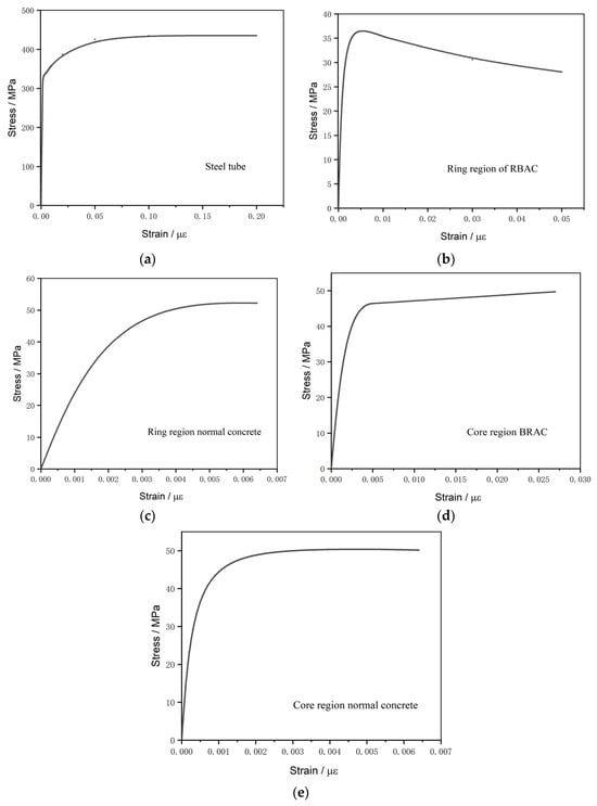 The finite element analysis was conducted by using the constitutive model of the corresponding material. In this study, five kinds of materials were simulated: core RBAC, ring section RBAC, core common concrete, ring common concrete, and steel. The behavior of the steel tube was simulated with the constitutive model described in Section 4.1. The relationship between strain and stress can be calculated with Equation (1). The simulation of ring RBA concrete behaviors was conducted using the constitutive model of confined RBAC outlined in Section 4.2. The behaviors of core RBA can be expressed as Equations (24)–(30) in Section 4.4. The constitutive relationship model of single- and double-confined common concrete can be found in previous research [], as Equations (31)–(39). Equation (31) is derived from studies conducted by Mander et al. [] and Lim and Ozbakkaloglu []. Equations (33) and (36) are derived from Lim and Ozbakkaloglu’s research [] and modified by Ahmed et al. []. Equation (34) is derived from the literature []. Equations (38) and (39) are provided by Mander et al. [], and Equation (39) is provided by De Nicolo et al. [].
