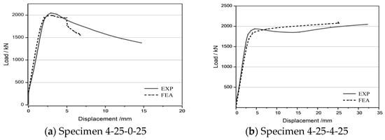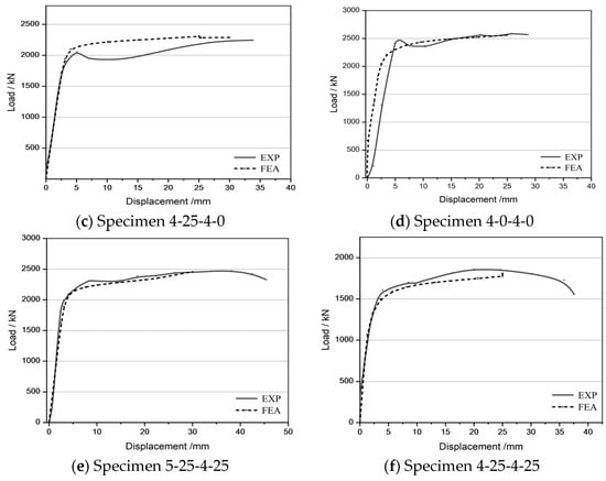 The ultimate load of each specimen is shown in Table 5. It can be seen from the data in the table that the bearing capacities of specimens with different conditions are different. It must be stated that the number of test specimens is indeed relatively small. Subsequently, the sample size needs to be expanded and the experiment repeated to enhance the reliability of the conclusion. The ultimate load of specimen 4-25-0-25 is 2048.6 kN, which is nearly the same as that of specimen 4-25-4-25. The ultimate load of specimen 4-25-0-25, with an inner steel tube, is just 0.14% higher than that of the counterpart without an inner steel tube. It is obvious that the inner steel tube under this condition had a limited effect on the ultimate load of specimens.