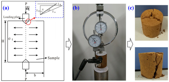 Figure 1a shows the underlying principle of the UPT. Two cone-shaped soils form under the action of the two loading plates at both the top and bottom of the soil samples. These cone-shaped soils serve as rigid bodies that push against the soil sample, and the surrounding soils are thus radially displaced. Tensile cracks develop along the radial direction. Based on the law of energy conservation [18,19], the tensile strength of the soil can be calculated using the following formula [24]: