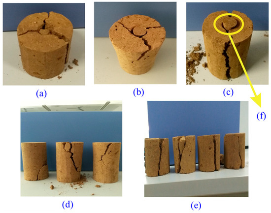 Images of tensile failures of undisturbed loess samples with height-to-diameter ratios of 1 (a), 1.5 (b), and 2 (c). (a,b) show three-part radial failure, (c,e) show two-part radial failure. (d) shows an inclined failure, and (f) shows a cone-shaped wedge failure.
