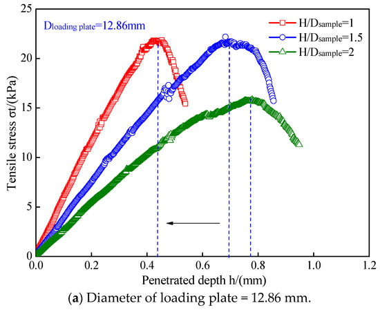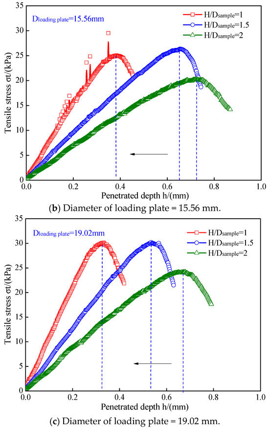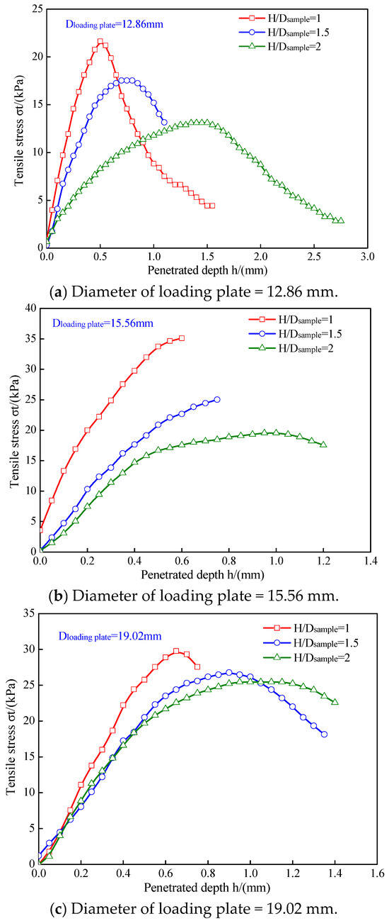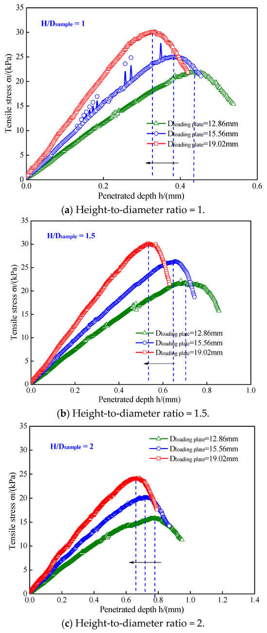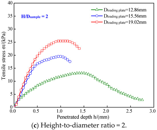 The tensile stress–penetration depth curves of the undisturbed loess samples under loading plates with different diameters are shown in Figure 8. The loading plate diameter can influence the tensile failure pattern. Generally, for an undisturbed loess sample with a certain height-to-diameter ratio, with an increase in loading plate diameter, the tensile failure pattern changed from plastic failure to brittle failure. For example, for a given sample with a height-to-diameter ratio of 1, the tensile stress first increased to the peak value and then decreased rapidly when the loading plate diameter was 19.02 and 15.56 mm, while it increased slowly to the peak value and then slowly decreased when the loading plate diameter was 12.86 mm. This showed that, as the diameter increased, the failure pattern of the undisturbed loess samples varied from plastic to brittle.