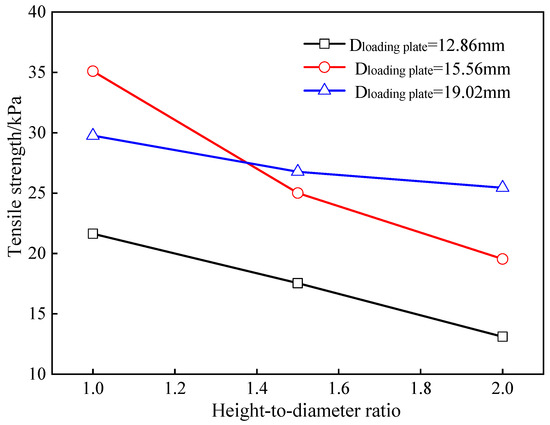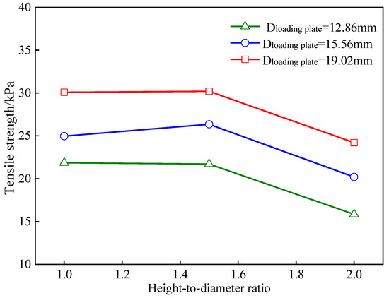 From Figure 6, it can be observed that the height-to-diameter ratio also significantly influenced the tensile strengths of the undisturbed loess samples. The effects of the height-to-diameter ratios on the tensile strengths of the undisturbed loess samples are shown in Figure 7. With an increase in the height–diameter ratio, for a given loading plate with a certain diameter, the tensile strengths of the undisturbed loess samples gradually decreased. This can be attributed to the following reasons: Under a loading plate with a certain diameter, the size of the conical wedge formed in the UPT was determined. As the height-to-diameter ratio increased, the position of the conical wedge approached the two ends of the undisturbed loess sample. The tensile stress in the undisturbed loess sample was therefore uneven, and the amount of soil in the ultimate state during failure was small, resulting in a small tensile strength from the theoretical Formula (1).
