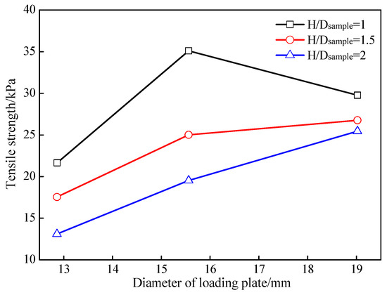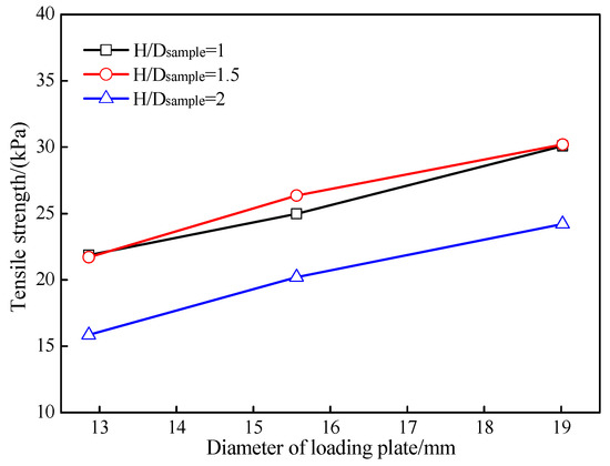 From Figure 8, it can also be found that the loading plate diameter also significantly influenced the tensile strengths. Figure 9 shows the effects of the loading plate diameter on the tensile strengths of the undisturbed loess samples. With an increase in the loading plate diameter, for a given height-to-diameter ratio, the tensile strengths of the undisturbed loess samples gradually increased. This can be attributed to the following reasons: For an undisturbed loess sample with a certain height-to-diameter ratio, the larger the diameter of the loading plate, the larger the conical wedge formed. At this time, the acting points of the radial shear force and bending moment were closer to the middle of the undisturbed loess samples. The more soils in the ultimate state of failure, the higher the tensile strength.