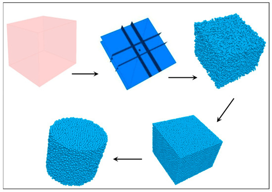 The DEM was established as follows: A domain where the calculations were to be conducted was first built, and the boundary of the model was then set. The bonded particles were generated within the model boundary, and it reached a balance via multiple calculations. The balanced particles’ assembly was then cut into a cylindrical model with designated dimensions. The loading plates in the UPT were simulated by setting two plates with certain diameters in both the top and bottom of the cylindrical particle model. The data of axial stress and displacement during the DEM simulation for the UPT were monitored and recorded using the FISH codes in PFC3D. By using Formula (1), tensile stress in the DEM simulation was measured.