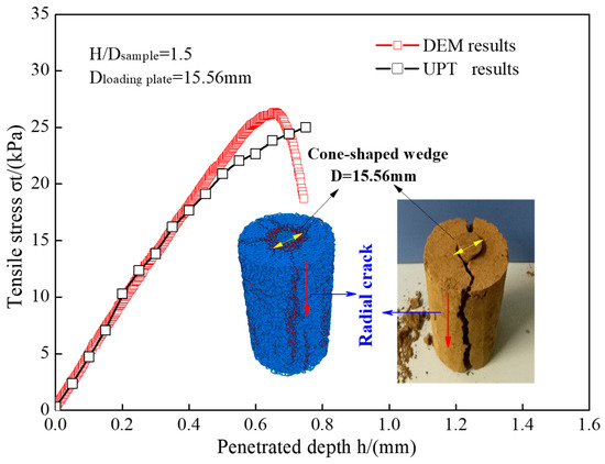 Comparison of tensile stress–penetration depth curves derived from DEM simulation and UPT.
