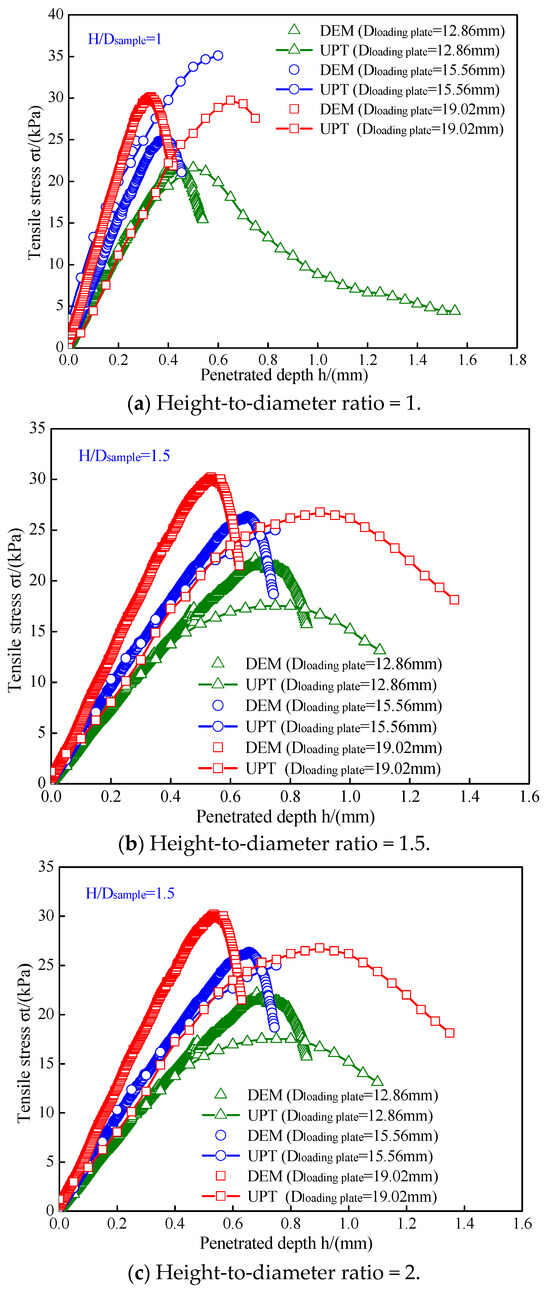 Figure 16 shows a comparison of the tensile stress–penetration depth curves obtained from DEM simulation and the UPT. Some simulated tensile stress–penetration depth curves matched perfectly with the measured tensile stress–penetration depth curves. For example, the simulated stress–penetration depth curve of the sample with a height-to-diameter ratio of 1 under a loading plate with a diameter of 12.86 mm successfully matched with the measured tensile stress–penetration depth curve. However, some of the simulated tensile curves did not match very well with the measured tensile stress–penetration depth curves. This is mainly due to the differences in the undisturbed loess samples. In the DEM models, the fundamental mechanical and deformation parameters were determined and calibrated by the UPT results of an undisturbed loess sample. Due to the slight differences in the undisturbed loess samples, the meso-parameters, such as the deformation parameter (emod) and strength parameter (pb_ten, pb_coh), measured by the performing UPT on one undisturbed loess sample could not be completely suitable for all the undisturbed loess samples. This results in the tensile stress–penetration depth curves obtained by the DEM simulation showing errors.