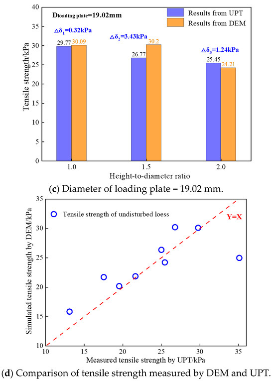 Although the simulated tensile stress–penetration depth curves cannot precisely match the measured tensile stress–penetration depth curves, the DEM can still successfully reflect the trends showing the variations in the undisturbed loess samples’ tensile strength with changes in the height-to-diameter ratio and loading plate diameter. Figure 17 shows a comparison of the undisturbed loess samples’ tensile strength values derived from the DEM simulation and UPT. In general, the tensile strength simulated via DEM simulation can match the tensile strength measured via UPT. The maximum absolute error of the tensile strength obtained via the DEM simulation and UPT was 10.13 kPa, and the minimum absolute error of the tensile strength obtained via the DEM simulation and UPT was 0.21 kPa. From Figure 17d, we can find that the tensile strengths simulated for the undisturbed loess sample were higher slightly than the tensile strengths measured via the UPT. In summary, DEM-based simulation can be used in addition to the unconfined penetration test to study the variation in tensile strength.