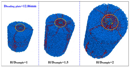 - The number of internal cracks increased with an increase in the loading plate diameter, while it first increased and then decreased with an increase in the height–diameter ratio.