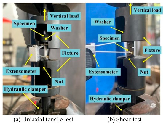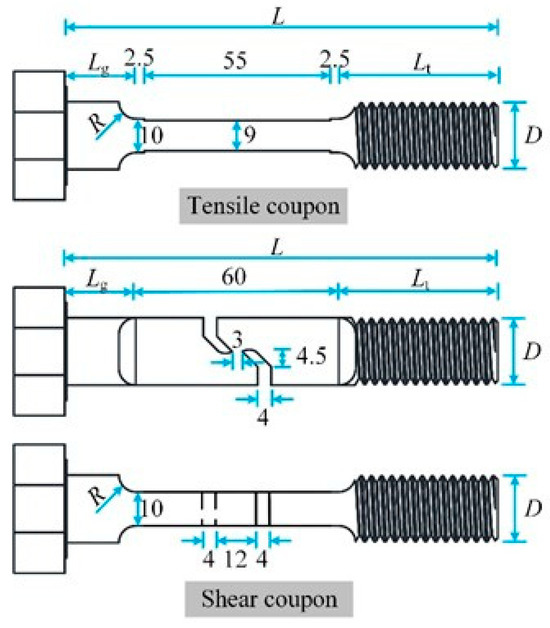 Figure 2 shows the test set-up of the uniaxial and shear coupon tests. The specialized loading fixture is used to test all specimens at room temperature, while the washer and tension nut are employed to place test coupons to ensure smooth loading transfer according to ISO 898-1: 2009. The upper and lower ends of this fixture are hydraulically clamped, and tensile and shear loads are applied through the vertical velocity of 0.2 mm/min on the upper fixture during the whole test period [26,29].
