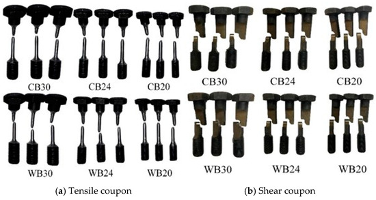 Table 1 lists the measured geometrical dimensions of test coupons, in which CB and WB refer to common and weathering high-strength bolts with the following number representing the bolt diameter, and the letters T and S, respectively, corresponding to the tensile and shear coupons. The maximum manufacturing error of the tensile coupon is shown for CB24-T3 within 1%, while it is shown for CB20-S1 with the dimension error of 0.13 mm for the shear coupon. The average manufacturing deviation of the tensile and shear coupons is 1% and 3%, respectively.