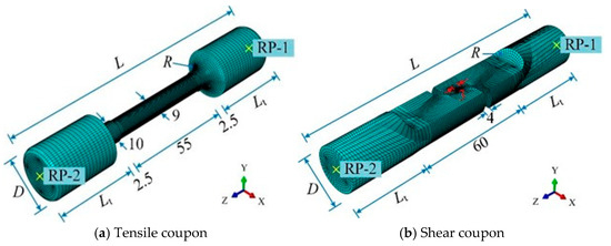 Figure 4 shows the FE model of test coupons, where the simplified geometric shapes of both specimen types are used for saving time-consuming calculations. The bolt diameter D, the total length L and the loading length Lt correspond to the geometrical dimensions presented in Figure 1 and Table 1.