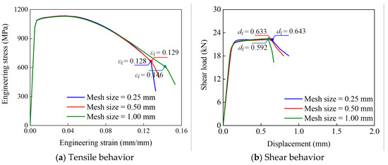 Meshing size and element type selection are two basic points affecting mechanical responses and fracture behavior estimation. FE simulation on tensile and shear coupons of CB24 is presented as an example herein to discuss meshing and element type sensitivity. Figure 5 presents mesh sensitivity analysis with fracture properties for tensile and shear simulations from a mesh size of 1.00 mm to 0.25 mm. The tensile and shear resistance predicted from mesh size of 1.00 mm are slightly higher than those of 0.50 mm and 0.25 mm with a maximum deviation of less than 3%. A minor deviation (<4%) of tensile and shear fracture prediction is found between the simulation results from a mesh size of 0.50 mm and 0.25 mm, compared to over 14% differential with tension estimated based on a mesh size of 1.00 mm. In addition, the time consumption of the mesh size at 0.50 mm is only 1/16 that seen at 0.25 mm.