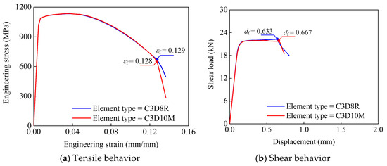 Two commonly used element types in FE modeling are 8-node hexahedral solid elements with reduced integration (C3D8R) and 10-node modified tetrahedron (C3D10M). Figure 6 presents sensitivity analysis with fracture properties for tensile and shear simulations from the element types of C3D8R to C3D10M. It is found that the engineering stress–strain relations of tensile behavior captured by both element types are consistent, and the minor differences in the shear resistance and fracture point are also present in the shear load–displacement curves. Accordingly, both types of C3D8R and C3D10M can simulate the tensile and shear behaviors of specimens well, where C3D8R has the advantage of time–cost saving and C3D10M is capable of meshing heterosexual geometries, like bolt threads. Therefore, tensile and shear specimens are meshed by C3D8R following the media axis to improve the mesh transition, and C3D10M is applied to simulate high-strength bolts with real threads in the following section.