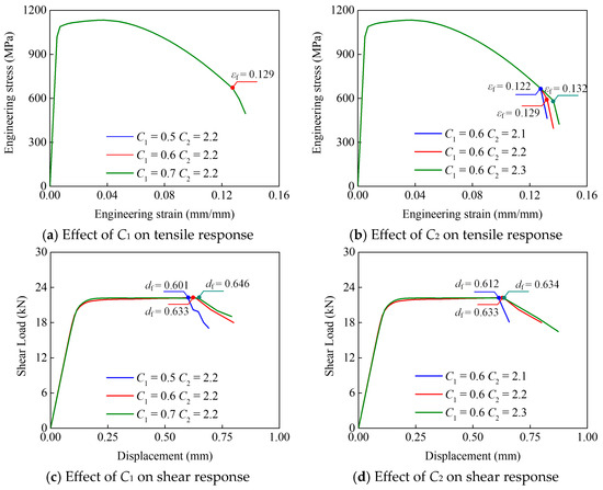 Figure 7 shows the effect of the parameters C1 and C2 on tensile and shear fracture responses. The tensile and shear responses of CB24 are also taken as an example herein. It is found that the parameter C1 governing shear fracture shows a negligible impact on tensile fracture initiation, while the tensile parameter C2 shows a positive effect on the fracture displacement corresponding to C2 from 2.1 to 2.3. Both parameters C1 and C2 represent a positive correlation to shear fracture responses, but the effect of the shear parameter C1 (deviation > 5%) is much more significant than that of the tensile parameter C2 (deviation < 3%).