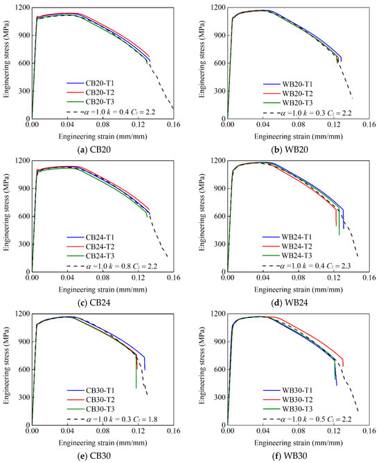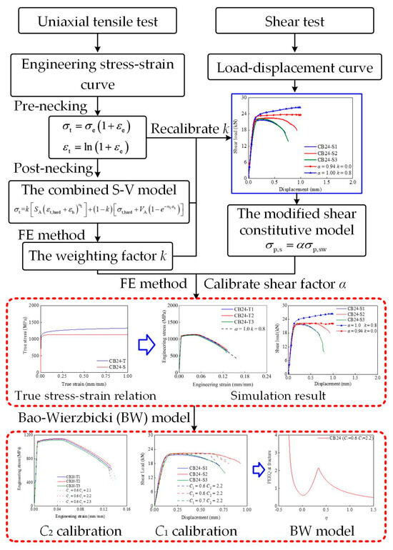 Figure 8 shows the calibration process for capturing the true stress–strain relation and damage model, also taking CB24 as the example. Pre-necking engineering stress–strain curves obtained from uniaxial tensile tests are transferred to the true stress–strain relation, and then the combined S-V model is used to describe the true stress–strain relation after necking, with the collaboration of the FE method to decide the weight factor k, thereby finishing the tensile true stress–strain relation calibration. Such a calibration could be found in the literature [8].