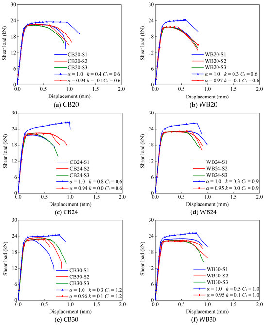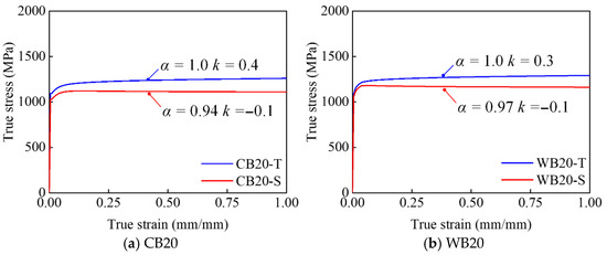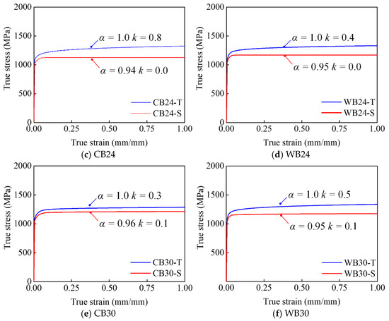 Figure 9 shows the calibration of the tensile and shear true stress–strain relation based on the combined S-V model and the modified shear model. For both materials, the weight factor k ranges from 0.3 to 0.8 within 0 to 1.0 for the tensile stress–strain relation, while it ranges from 0.1 to −0.1 as the diameter of high-strength bolts decreases from 30 mm to 20 mm. As for the shear factor α, it takes the lowest value of 0.94 for CB20 and CB24, while the highest value of 0.97 is seen for WB20, with an average reduction of 0.95 for common and weathering high-strength bolts.
