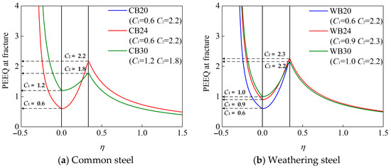 In Equation (5), metal fracture dominated by shear failure is defined as −1/3 ≤ η ≤ 0. The stress triaxiality η = η0 = 1/3 is found as the boundary to determine void growth at η ≥ η0 = 1/3 and the combined failure mechanism at 0 ≤ η ≤ 1/3.