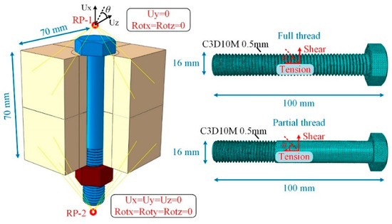 Figure 13 shows an FE model simulating high-strength bolt tests in [32]. Two 70 × 70 × 70 mm steel blocks are used to transfer loads onto high-strength bolts, with a Young’s modulus of 210 GPa and a Poisson ratio of 0.3. Grade 10.9 s M16 full-thread and partial-thread high-strength bolts are investigated, and the actual thread pits are finely modeled, according to EN ISO 4017 [33] and EN ISO 4014 [34]. The element size of 0.5 mm following the above study is applied to mesh both types of high-strength bolts with the element type of C3D10M.