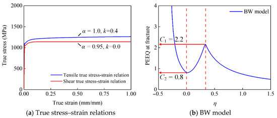 The Bao and Wierzbicki model (BW model) with only two material parameters [22], as one of the uncoupled damage models, is proved to describe the tensile and shear fracture behaviors of steel structures, and thus it could be also applied to discuss those of high-strength bolts. As expressed in Equation (5), the BW model defines the relation between the stress triaxiality η and the fracture plastic strain (PEEQ), where C1 and C2 represent the shear and tension parameters obtained from the corresponding tests.